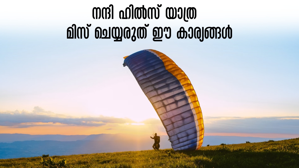 നന്ദി ഹില്സിന്റെ പച്ചപുതച്ച മലനിരകൾ കാണാൻ പാരാഗ്ലൈഡിങ് മികച്ച മാർഗമാണ്. നിരവധി കമ്പനികൾ ഇവിടെ പ്ലാഗ്ലൈഡിങ് പാക്കേജുകൾ ഒരുക്കുന്നു, കാലാവസ്ഥയും കാറ്റും അനുകൂലമാണെങ്കിൽ മാത്രമേ നിങ്ങൾക്ക് ഇത് ചെയ്യാൻ കഴിയൂ. അനുയോജ്യമായ സമയം നോക്കി പാരാഗ്ലൈഡിങ് നടത്താം.